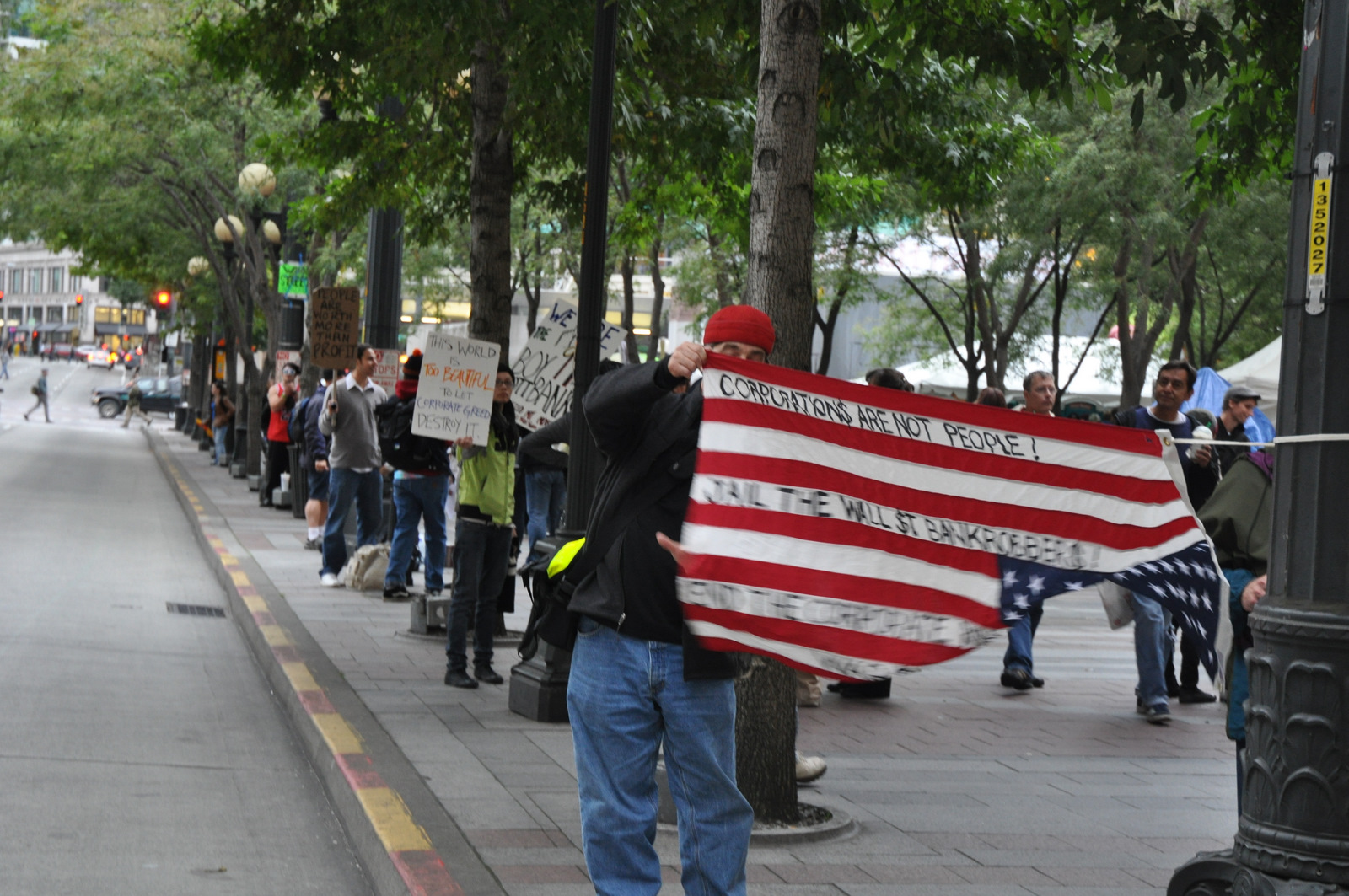 The tents are gone now, but the signs are still there. Clinging to the edge of the curb, Occupy Seattle shows its plumage in a solid bloc along Fourth Avenue, waving signs that weave a hundred issues into a central message: “our United States of America needs to do better, and we’re tired of asking politely.”