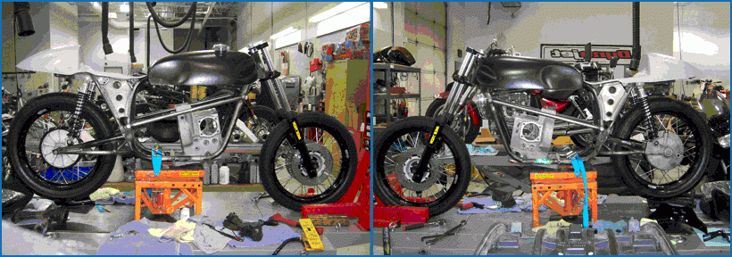 The R-bike will be painted in Rennsport racing livery over a Glass From the Past tank and a race fairing from Boxercafe.com. The engine squeezes its 38mm Mikuni charge through big valve R90S heads, using custom Venolia pistons to keep compression fancy-high. Relocated wrist pins on the con rods allow shorter cylinders to increase cornering clearance (no word on whether there are casters mounted to the valve covers).